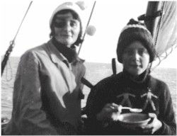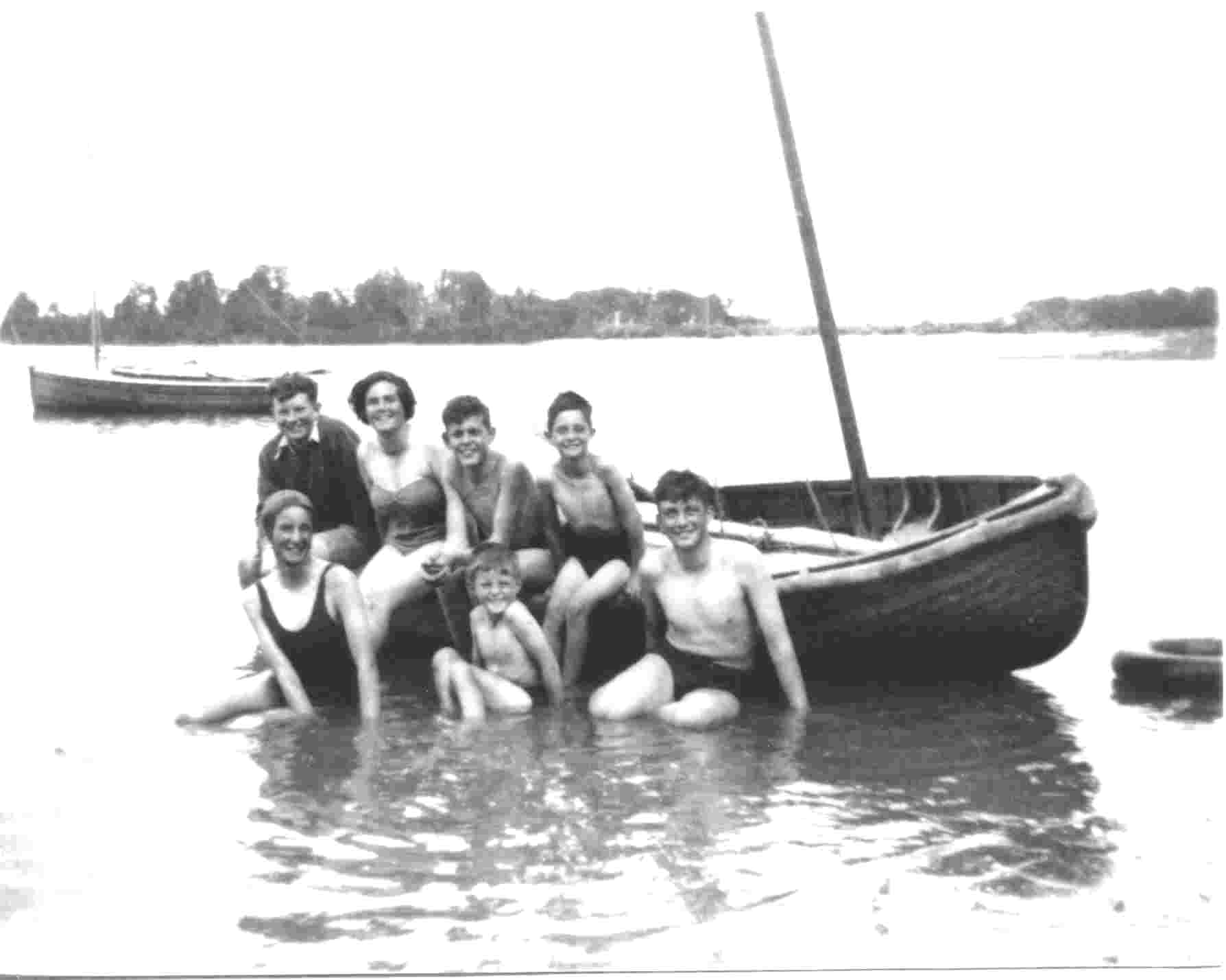 Iken 1953 Stewart, Margaret, Ken Webb and Ian on the boat, Barbara and Robert. Who is in the water far right? Frank?.