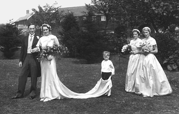 Daniel and Phyllis Craig's Wedding day June 1st 1935. Daniel and Phyllis were married at St. Margaret's church Leiston, on June 1st 1935. Their reception was held at Thorpeness Country Club (where this photograph was taken). The bridesmaids were Mary Craig, Dan's youngest sister and Sheena Duncan Millar, Phyllis' best friend from school, whose family owned a big estate in Scotland. The page boy was Anthony Marwood, their eldest nephew, son of Phyllis' sister Dorothy.