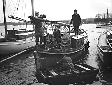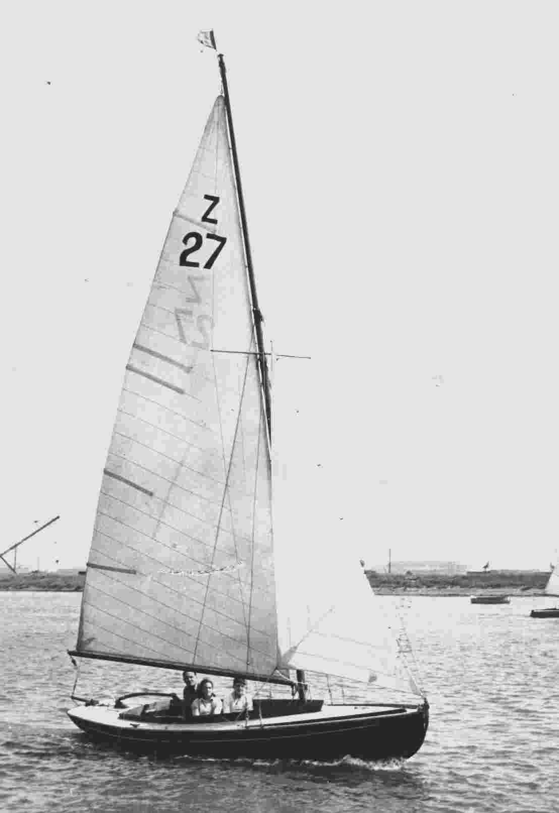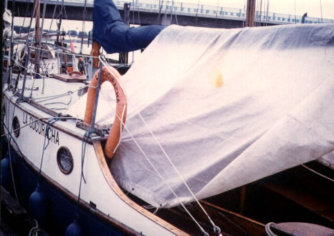 Dan, Ian and Barbara on board Chaperone, one of Dan's boats, in Holland in the mid 1950's. The mast has been taken down to go under a bridge, probably in Amsterdam. - but who is in the dinghy??? Robert? Stewart?